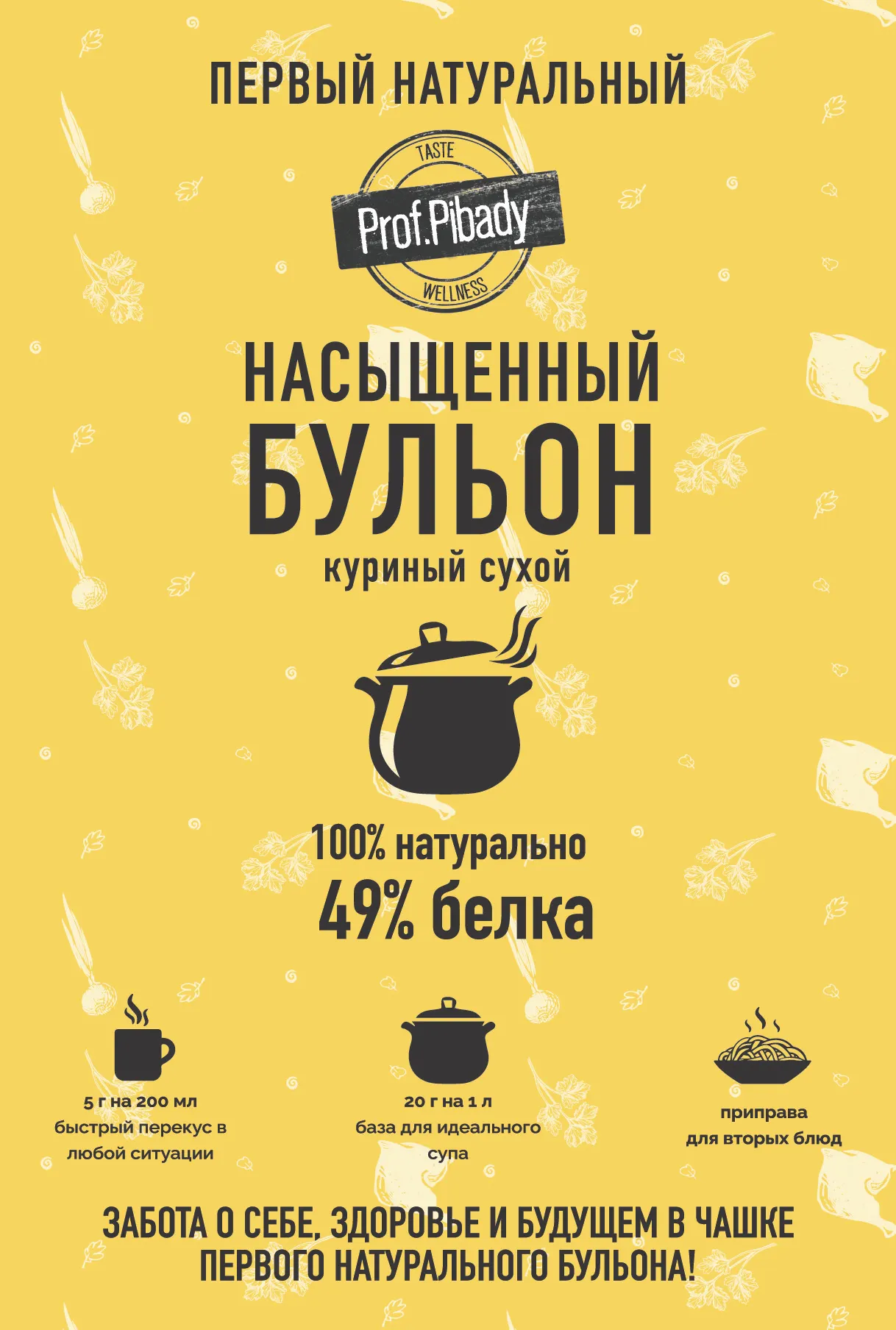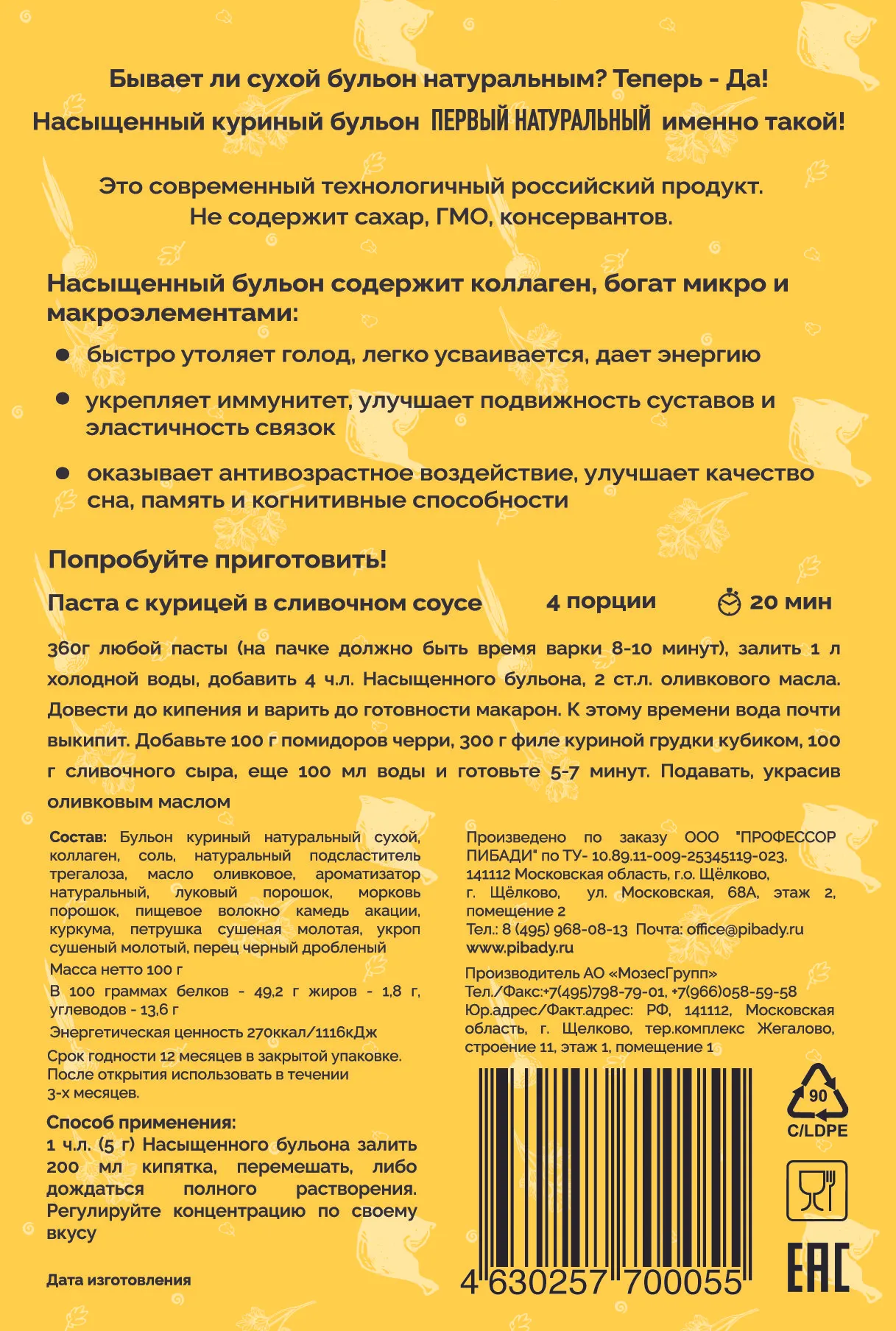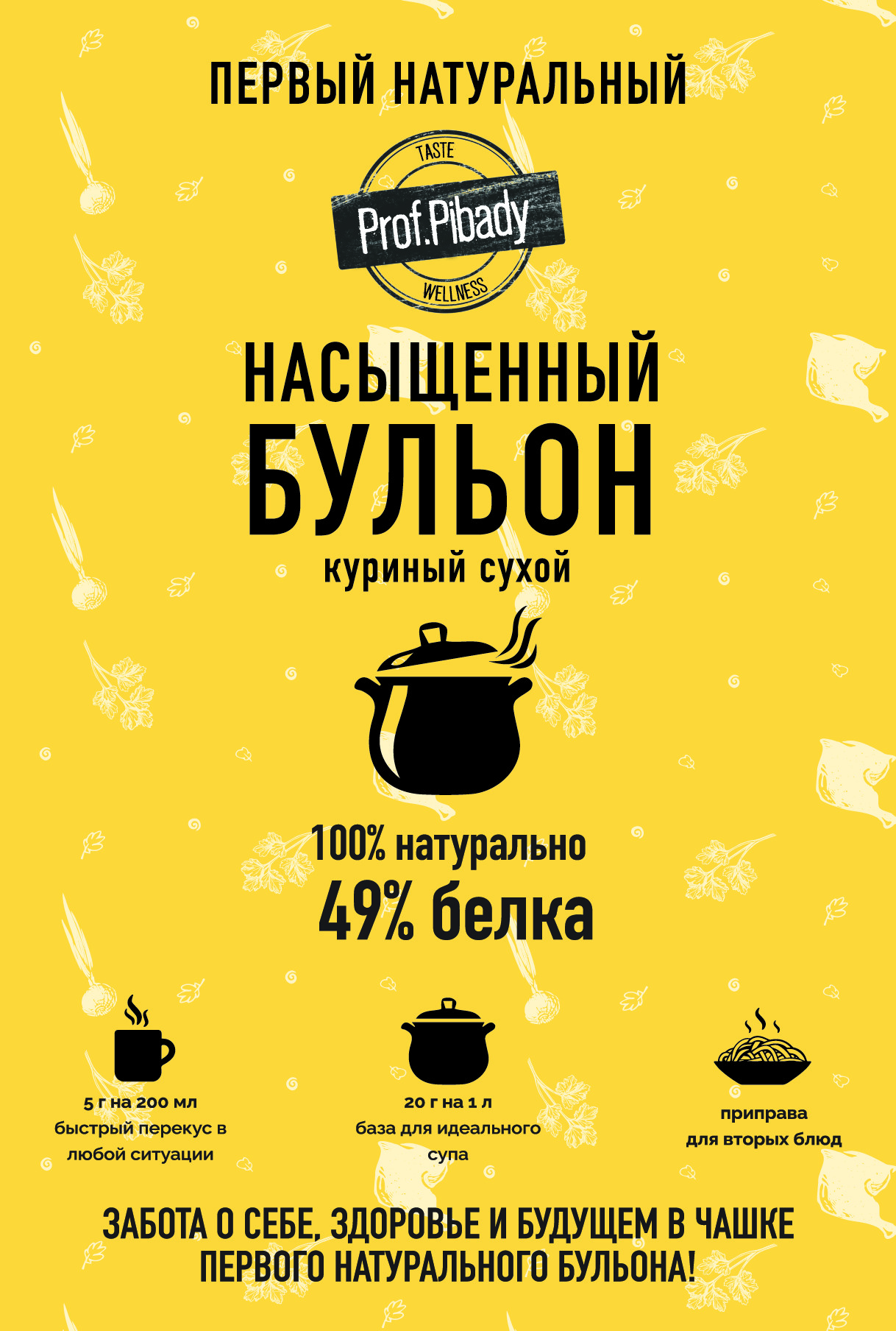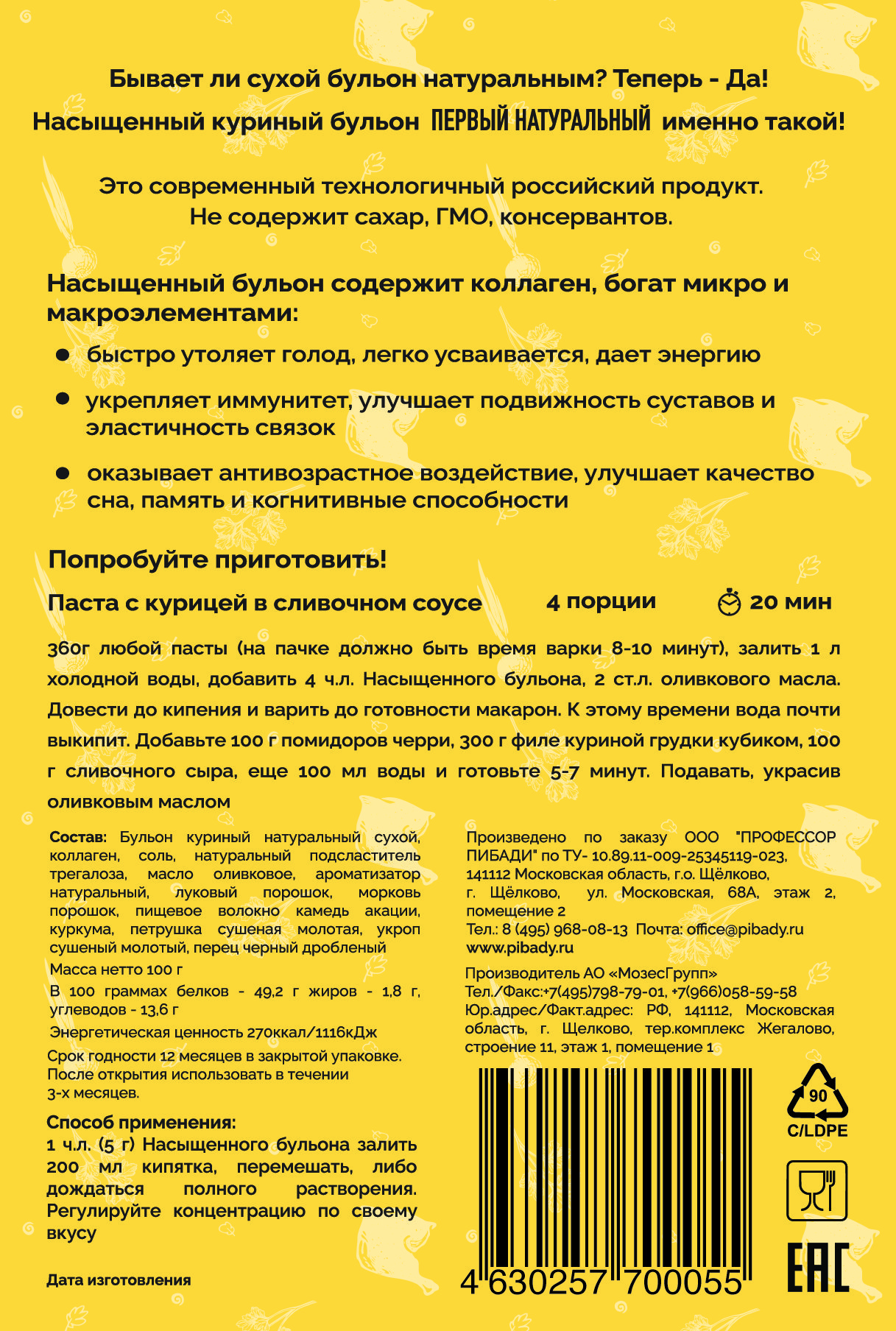 Первый натуральный насыщенный куриный бульон Насыщенный куриный бульон - это не только вкусный и ароматный напиток, но и настоящий кладезь полезных веществ для организма. Он содержит множество витаминов, минералов и антиоксидантов, которые помогают укрепить иммунную систему, улучшить кровообращение и поддерживать здоровье костей. Содержание пробиотика- благотворно влияет на ЖКТ и микробиом. Одним из главных преимуществ куриного бульона является его способность снижать уровень холестерина в крови. Это особенно важно для людей, страдающих сердечно-сосудистыми заболеваниями или имеющих проблемы с артериальным давлением. Кроме того, бульон богат белком, который необходим для роста и восстановления мышц. Куриный бульон также является отличным источником цинка, который играет важную роль в защите организма от инфекций и поддержании здоровья кожи и волос. Низкая калорийность является важным критерием выбора для людей ведущих здоровый образ жизни. Состав: Бульон куриный натуральный сухой, коллаген, соль, натуральный подсластитель трегалоза, масло оливковое, ароматизатор натуральный,морковь порошок, пищевое волокно камедь акации, куркума, петрушка сушеная молотая, укроп сушеный молотый, перец черный дробленый. Энерегтическая уенность на 100 гр продукта: белка-49,2 жиров-1,8, углеводов -13,6. Энергетическая ценность 270ккал/1116кДж.